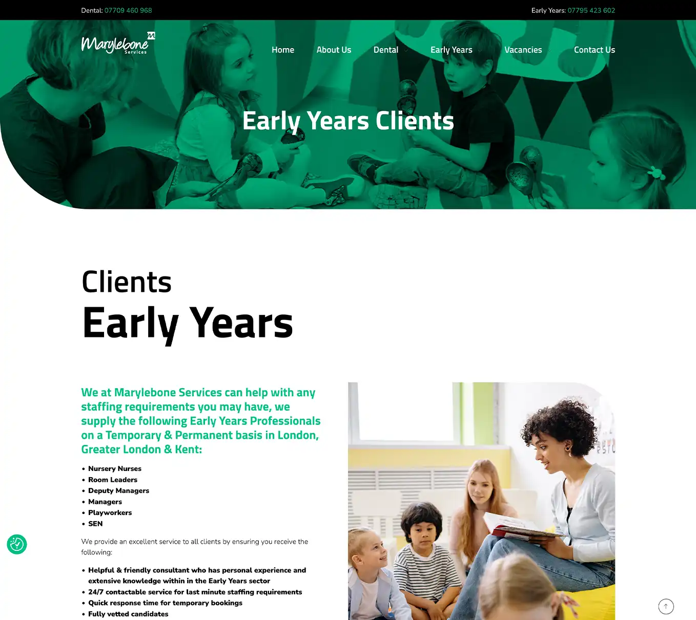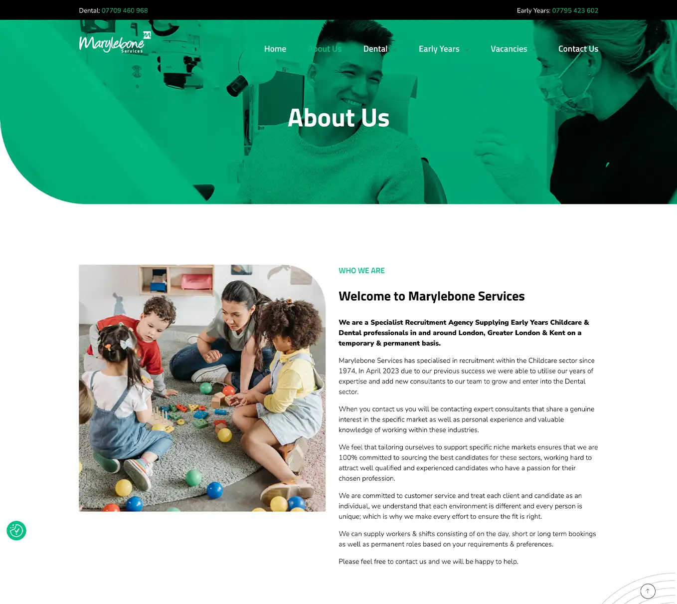 Website design, development and build for Marylebone Services. Marylebone Services is a London-based specialist recruitment agency established in 1974, focusing on providing temporary and permanent staff for the childcare (Early Years) and dental sectors. They serve London, Greater London, and Kent, placing qualified professionals such as nursery nurses, managers, dentists, and dental nurses.