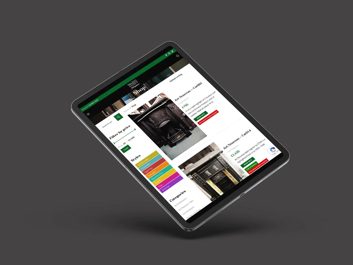 Online shop and e-commerce for Ward Antique Fireplaces. They were established in 1977 and based in South East London/Kent, are specialists in restoring and retailing original Victorian, Georgian, Edwardian, Art Nouveau, and Art Deco fireplaces. They offer comprehensive services, including metal polishing, stone restoration, and installation by experienced, gas-safe registered fitters.